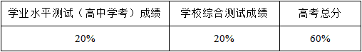 2.综合成绩计算:综合成绩由学业水平测试(高中学考)成绩、学校综合测试成绩、高考成绩三部分组成。综合成绩按“学业水平测试(高中学考)成绩(折算成满分100分)×20%+学校综合测试成绩(折算成满分100分)×20%+高考总分(折算成满分100分)×60%”计算形成。