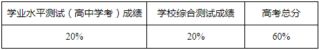 2.综合成绩计算:综合成绩由学业水平测试(高中学考)成绩、学校综合测试成绩、高考成绩三部分组成。综合成绩按“学业水平测试(高中学考)成绩(折算成满分100分)×20%+学校综合测试成绩(折算成满分100分)×20%+高考总分(折算成满分100分)×60%”计算形成。